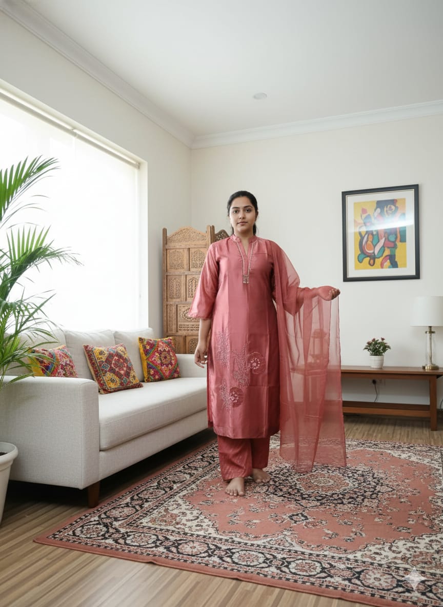 Refresh your ethnic wardrobe with this beautiful rust-pink embroidered suit set, a perfect blend of tradition and modern style. This three-piece ensemble includes a finely detailed embroidered kurta, matching pants, and a coordinated dupatta that creates a complete, graceful look for everyday wear, festive occasions, or casual gatherings.
