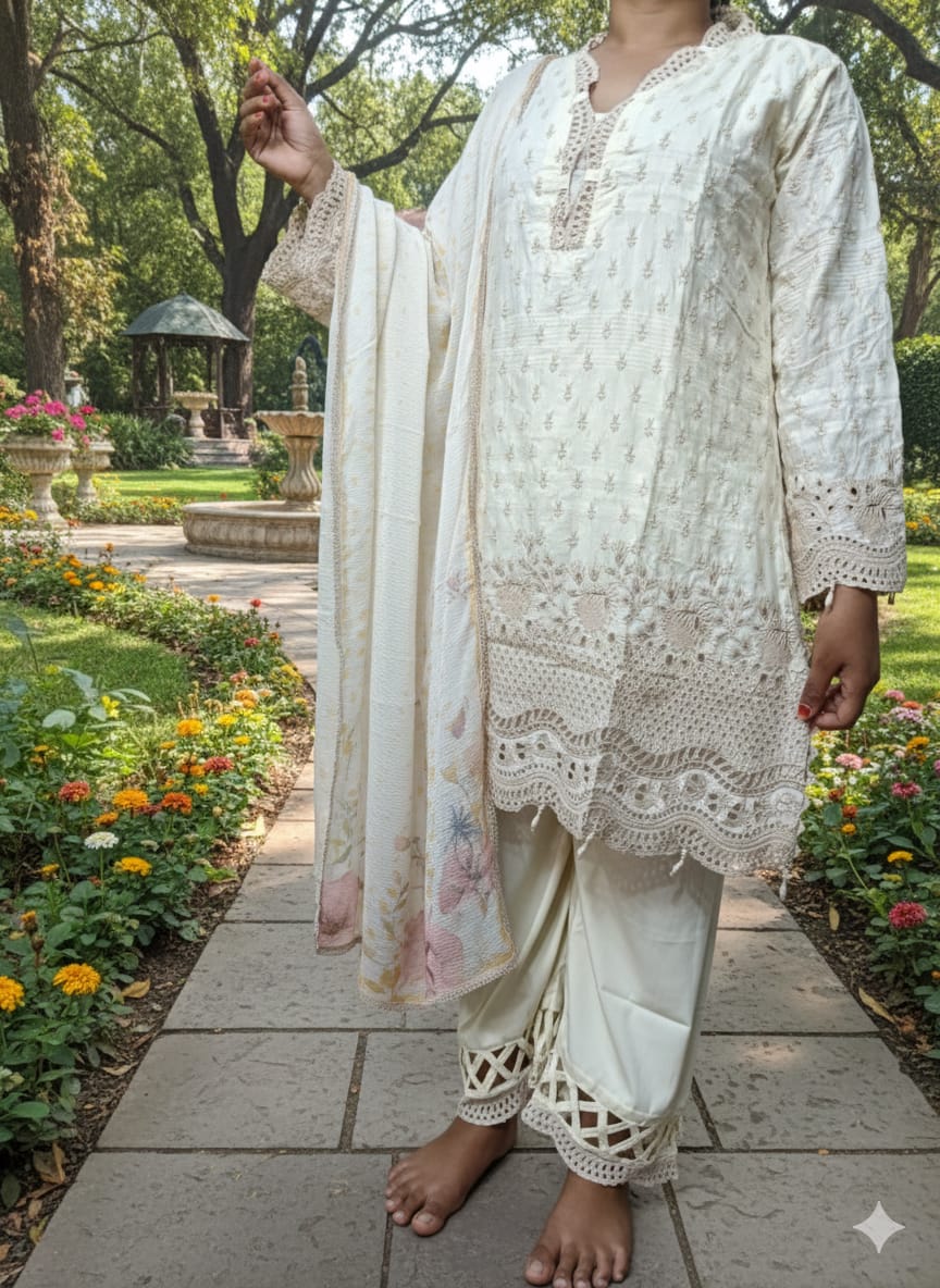 • Design: Detailed thread embroidery across the kurta and delicate lace or pattern accents for refined styling.