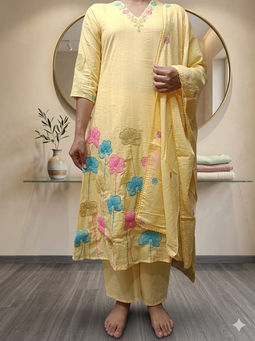 Elegant Sana Collection light Golden Yellow dress set featuring a beautifully designed kurta with delicate floral embroidery on the front, adding a soft and graceful touch. Paired with matching pants and a lightweight dupatta, this outfit offers a perfect blend of simplicity and elegance. Ideal for daily wear, casual outings, and small occasions, it ensures all-day comfort with a stylish look.