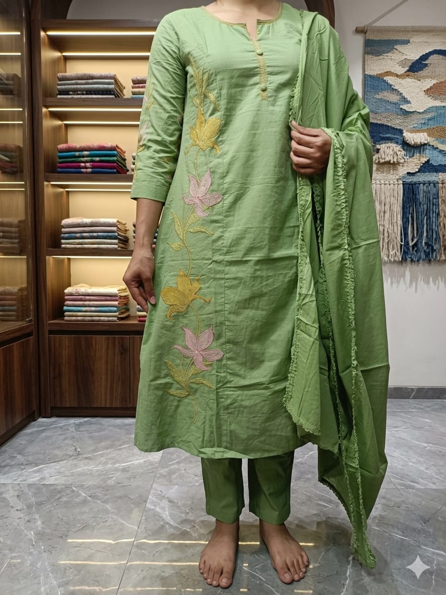 Elegant Sana Collection Parrot Green dress set featuring a beautifully designed kurta with delicate floral embroidery on the front, adding a soft and graceful touch. Paired with matching pants and a lightweight dupatta, this outfit offers a perfect blend of simplicity and elegance. Ideal for daily wear, casual outings, and small occasions, it ensures all-day comfort with a stylish look.