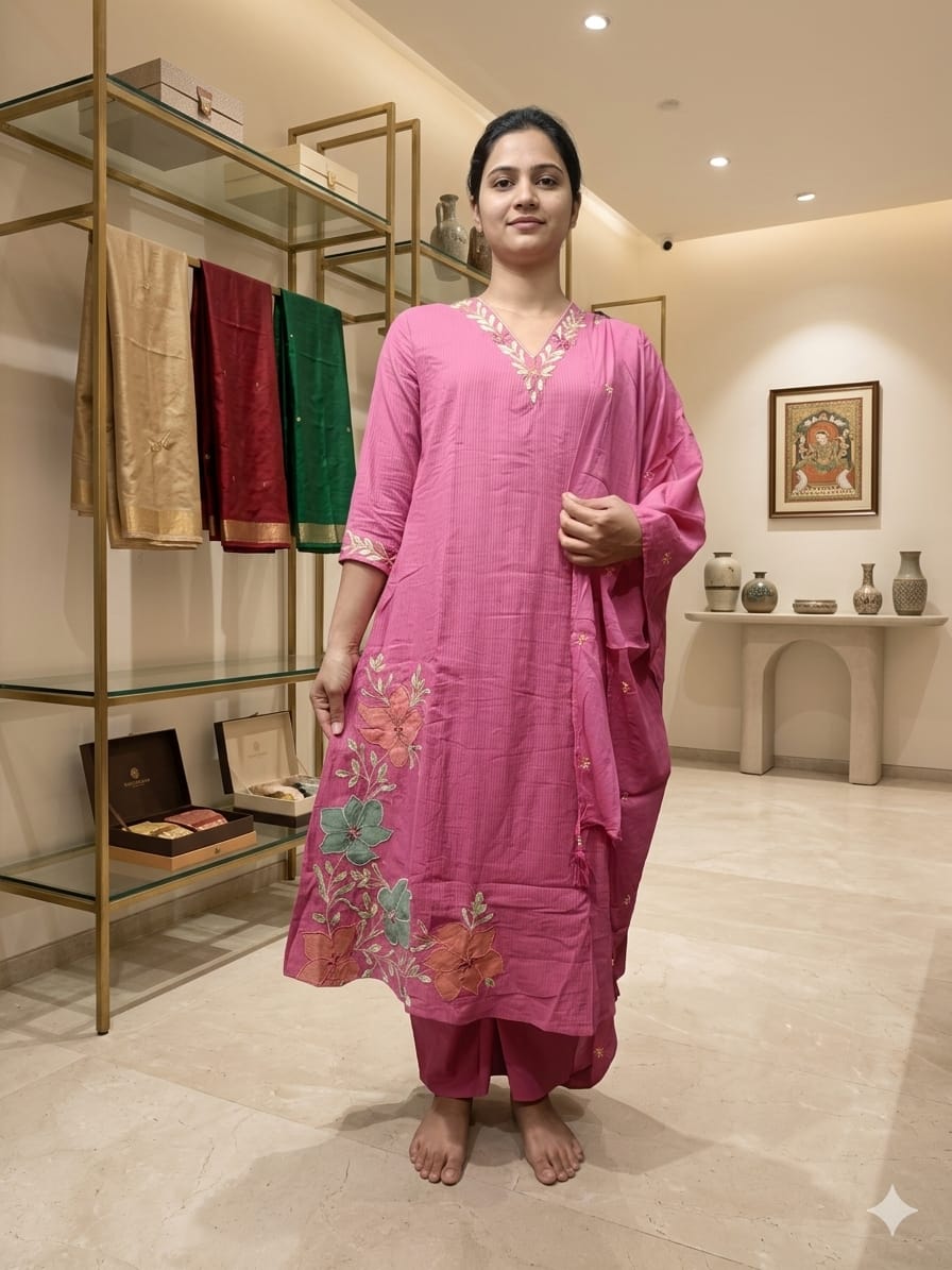 Graceful Sana Collection pink dress set featuring a beautifully designed kurta with subtle embroidery on the neckline and elegant floral patterns at the hem. Paired with matching pants and a soft dupatta, this outfit offers a simple yet classy look. Designed for comfort and everyday elegance, it is perfect for casual wear, small functions, and festive occasions.