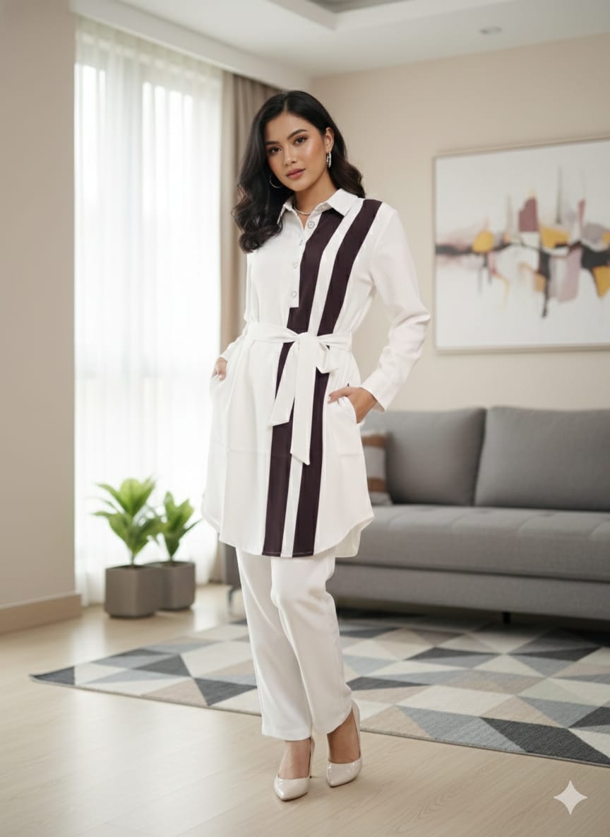 Step into effortless chic with this modern white and black western co-ord set, expertly designed to bring together contemporary style and everyday comfort. This fashionable ensemble features a coordinated top and matching pants in contrasting tones that elevate your look with a sleek, bold flair — perfect for casual outings, brunch dates, office smart-casual days, city strolls, or evening events. Western co-ord sets are a timeless trend that make styling easy while keeping you on the cutting edge of fashion.