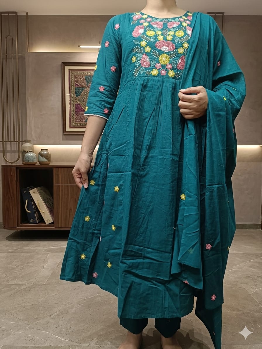 Elegant Sana Collection teal green dress set featuring a beautifully crafted kurta with vibrant floral embroidery on the neckline, adding a rich and eye-catching look. Paired with matching pants and a soft dupatta, this outfit offers a perfect blend of comfort and traditional charm. Ideal for festive occasions, casual gatherings, and everyday elegance, it gives you a graceful and stylish appearance.